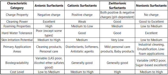 Selecting the best surfactant requires consideration of numerous variables, including application requirements, price, ecological conditions, and regulatory needs. The following table summarizes the essential features of the four primary surfactant groups:
